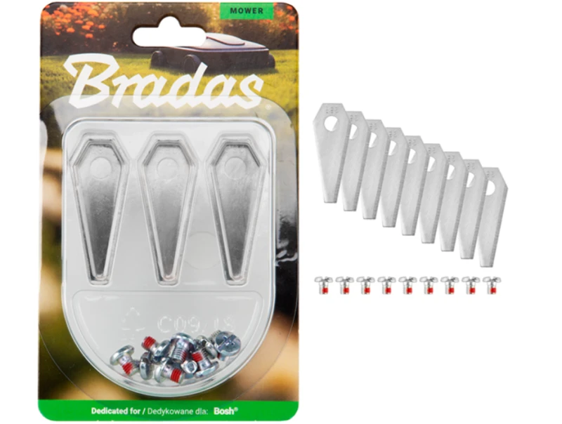 Wysokiej jakości noże zamienne przeznaczone do robotów koszących Bosch, zapewniające precyzyjne, równe i efektywne koszenie trawnika. Zestaw zawiera 9 ostrzy oraz 9 śrub montażowych, co pozwala na szybką wymianę zużytych elementów tnących i utrzymanie robota w pełnej sprawności.