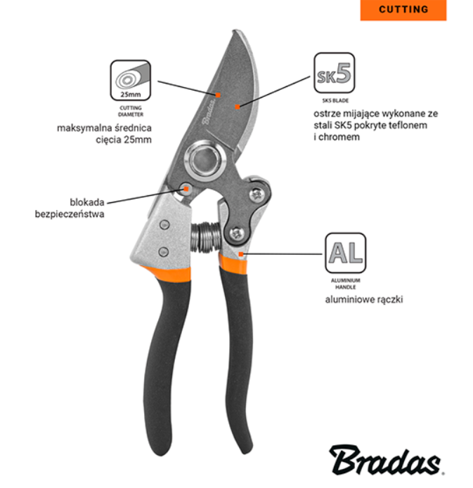 - ostrze: mijające (bypass), stal SK5, powłoka teflonowa + chrom