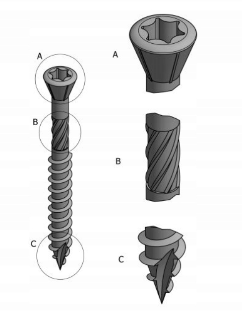 C) Specjalne nacięcia na końcu wkręta sprawia, iż wstępne nawiercanie nie jest konieczne. Gruby gwint z nacięciem ułatwia szybki montaż z dobrym zakotwiczeniem.